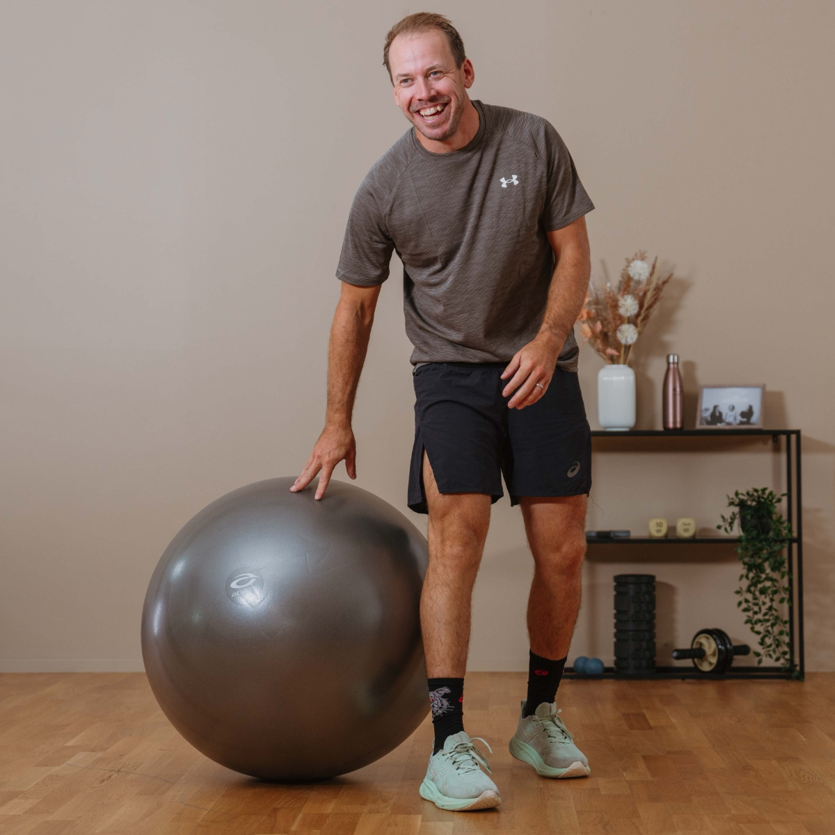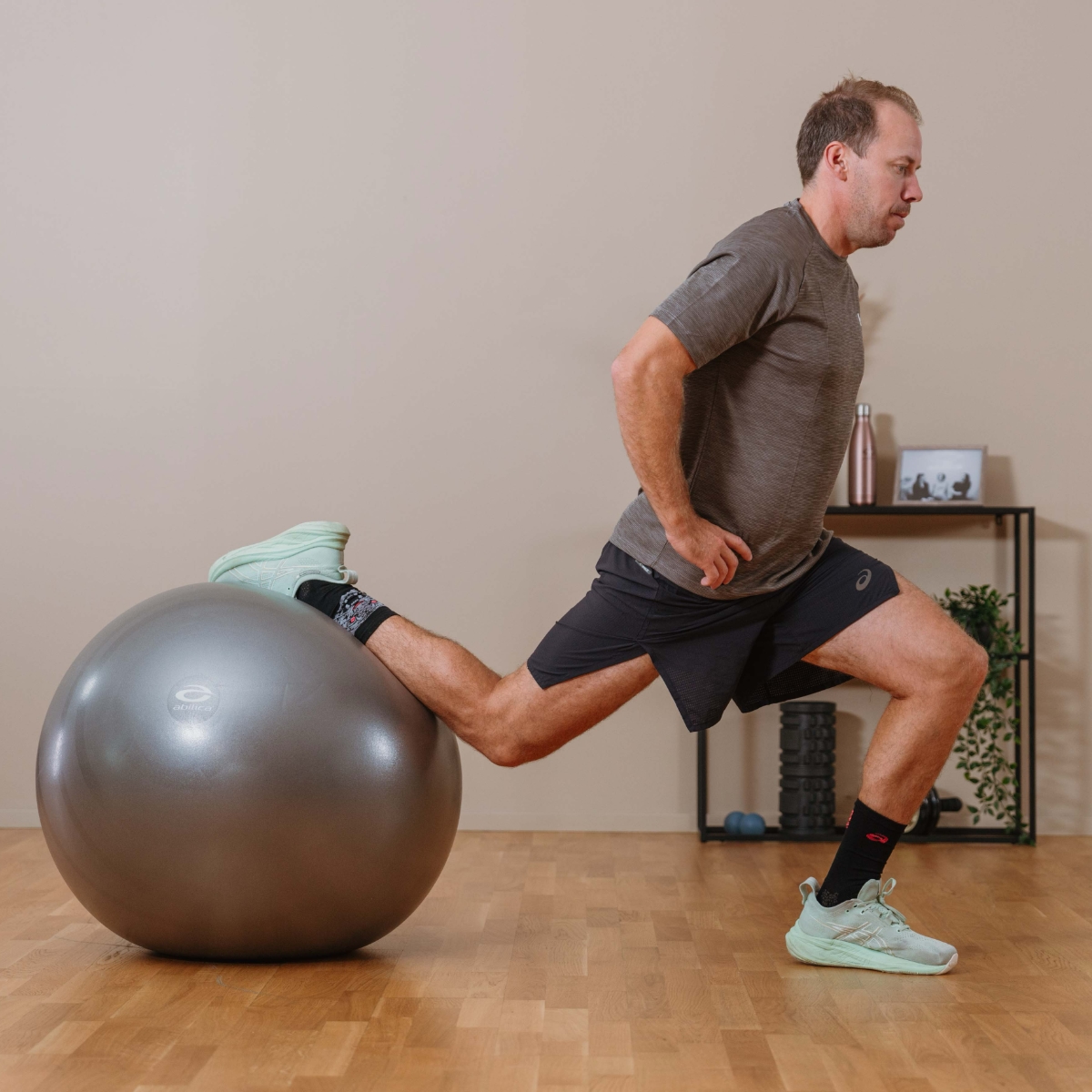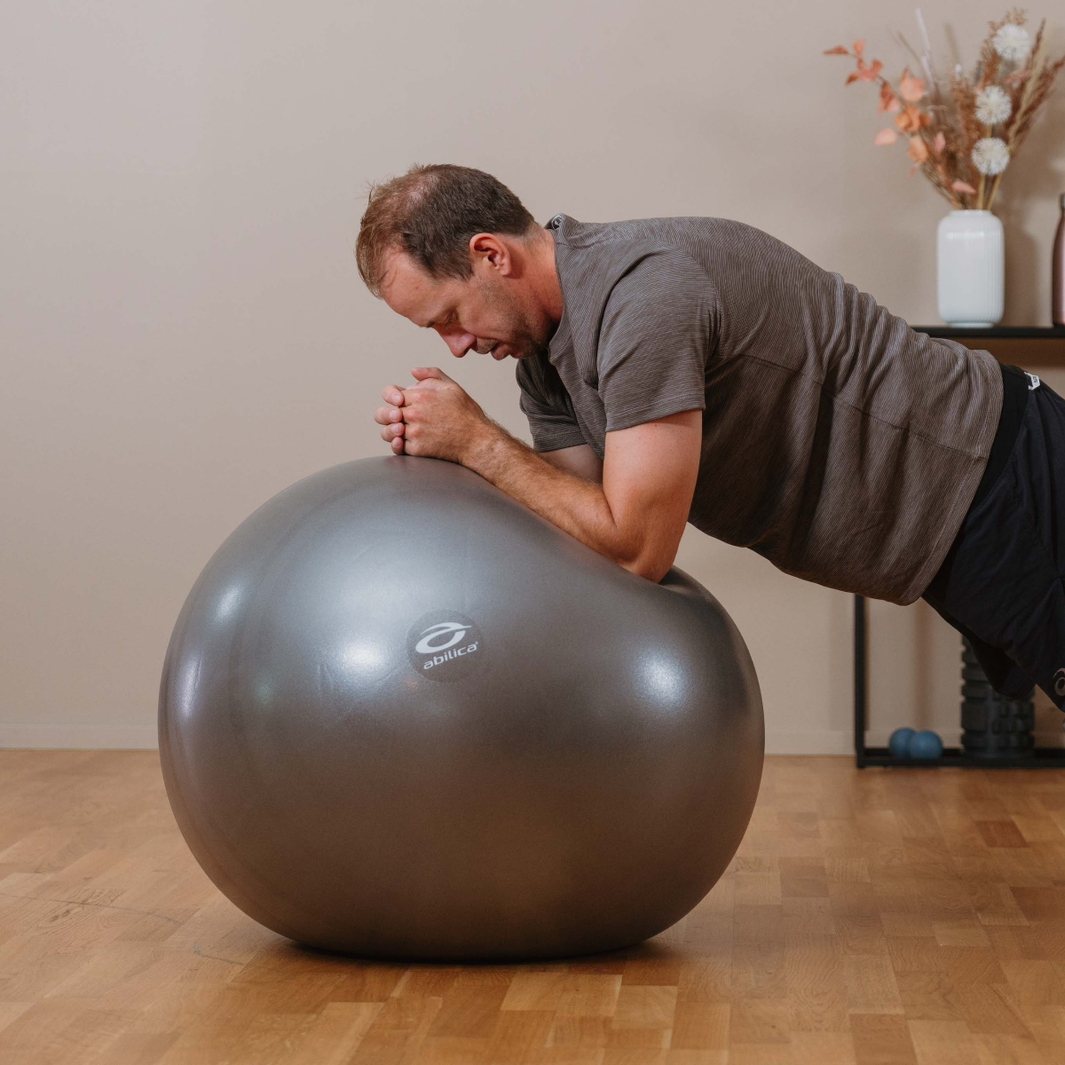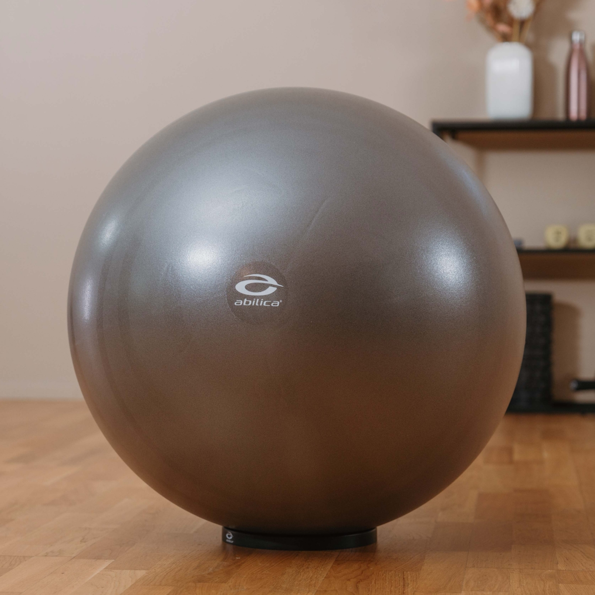 Fitnessbollen finns i en diameter på 65-75 cm och är grått färgad. Den är användbar för en mängd olika övningar, särskilt för ryggträning, stabiliseringsträning och balansträning. Bollen är även en lämplig ersättning för en vanlig stol och är explosionssäker. Varje boll levereras med en pump och kan stödja upp till 165 kg personvikt.