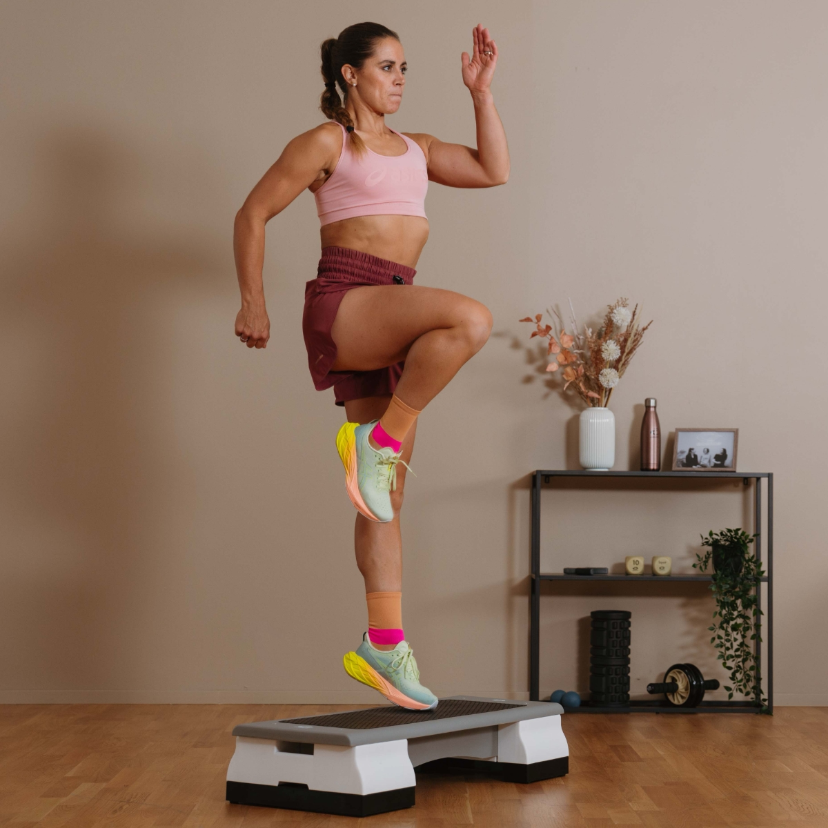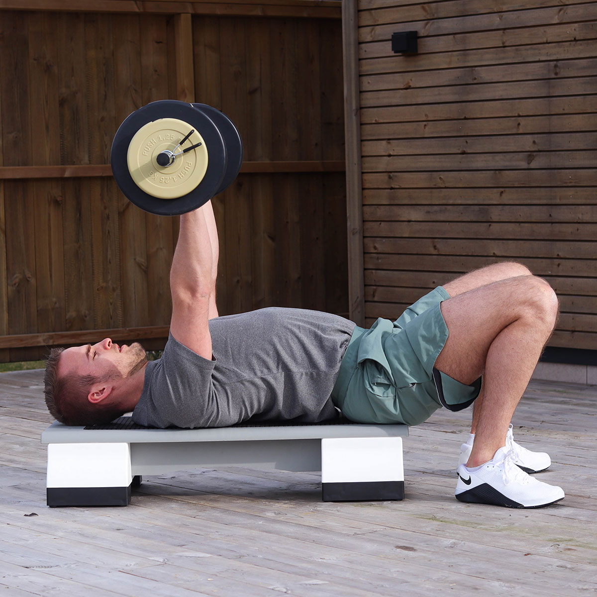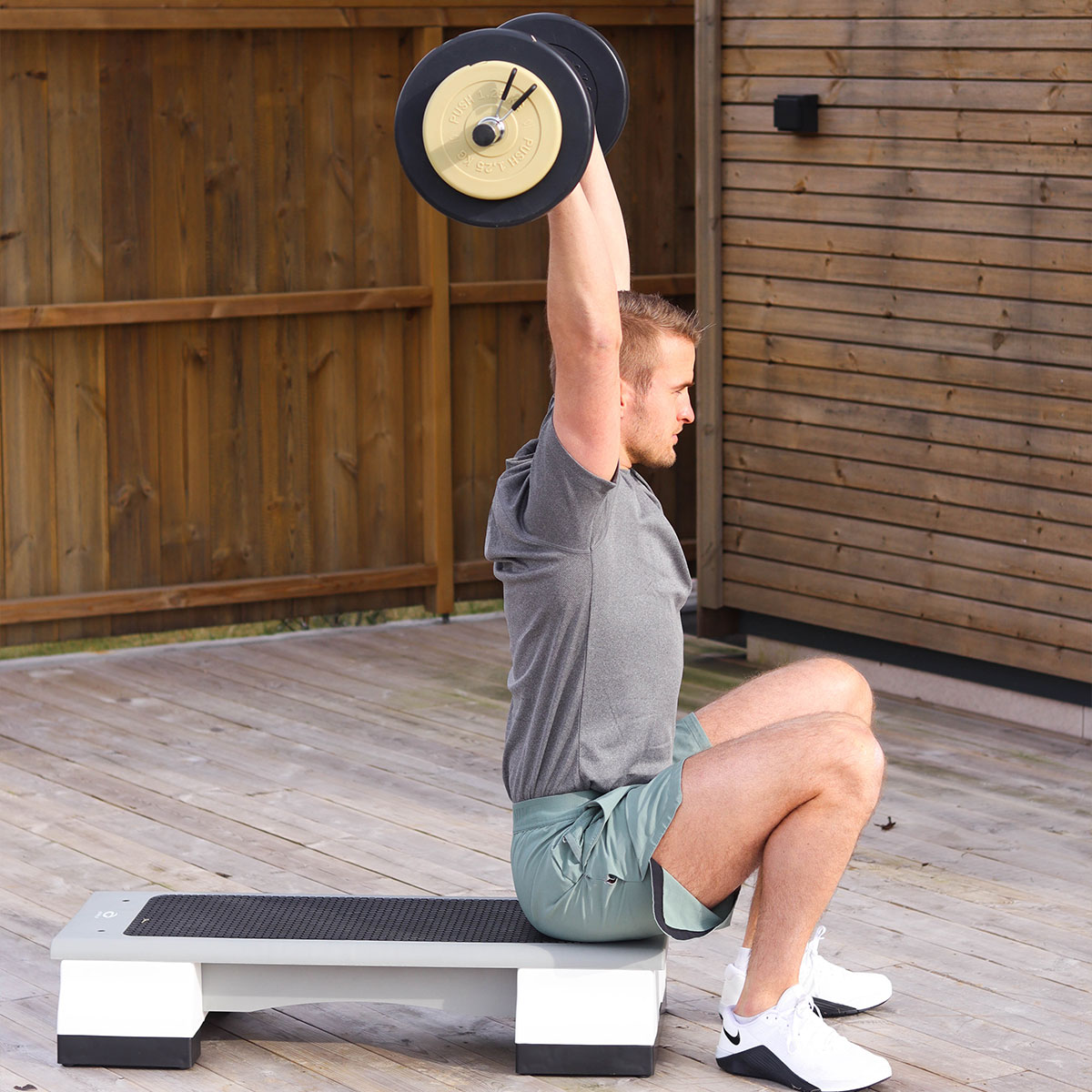 Denna stepbräda är perfekt för träning eller arbete. Den har en storlek på 35 x 90 cm och två höjdnivåer - 13 cm och 18 cm - vilket gör den lämplig för både nybörjare och erfarna användare. Med en ovansida belagd med gummimaterial ger den dig säkert fotfäste, och den mjuka plasten dämpar stötar, vilket gör den skonsam mot dina knän.