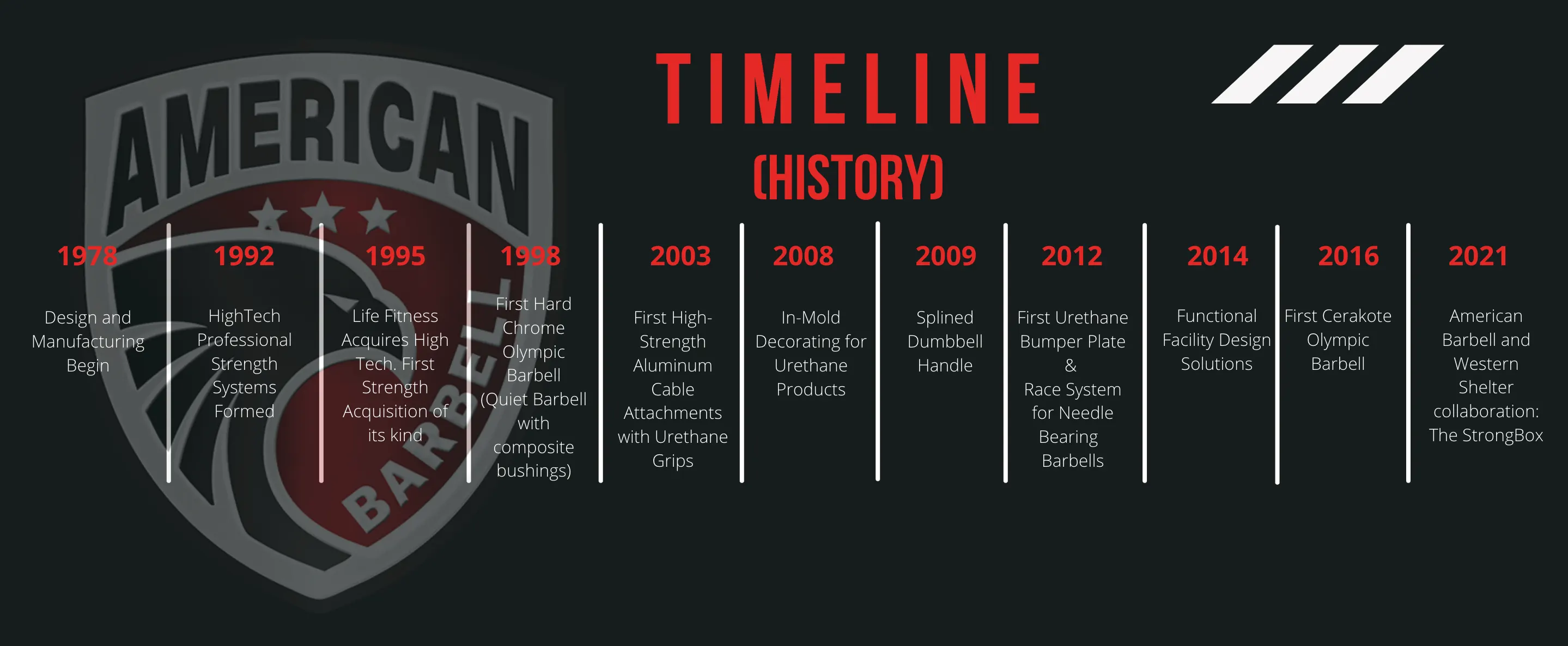 American Barbell började bygga gymutrustning 1978 och våra tillverknings- och kvalitetsnivåer har varit uppenbara sedan dag ett. Våra rötter började som OEM-tillverkare (Original Equipment Manufacturer) för de största namnen inom den globala fitnessindustrin. Under de senaste 40 åren har vi banat väg och skapat de mest anmärkningsvärda innovationerna och branschpremiärerna. Vår lista över prestationer sträcker sig från att skapa den första olympiska skivstången i hårdkrom (1998), den första stötfångarplattan i uretan (2012), den första olympiska skivstången i cerakote (2016), höghållfasta och lätta kabelfästen i aluminium, specialgjutna uretanvikter och vår branschledande serie-1-uretanhantel med patenterad splineteknik, för att bara nämna några exempel.