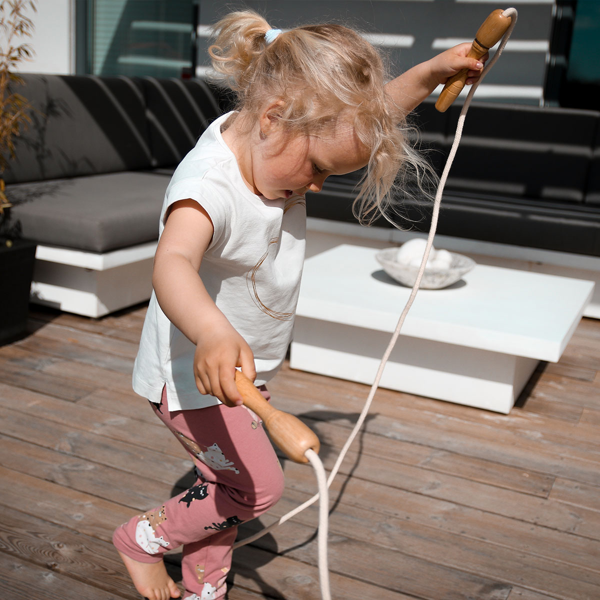 Med Abilica JumpRope ECO kan du utföra olika tekniker som att hoppa, dra tillbaka, korsa eller lägga repet plant på marken. Endast din fantasi sätter gränserna. Det mjuka vita bomullsrepets design är skonsamt mot dina vadmusklerna och trasslar inte upp sig.