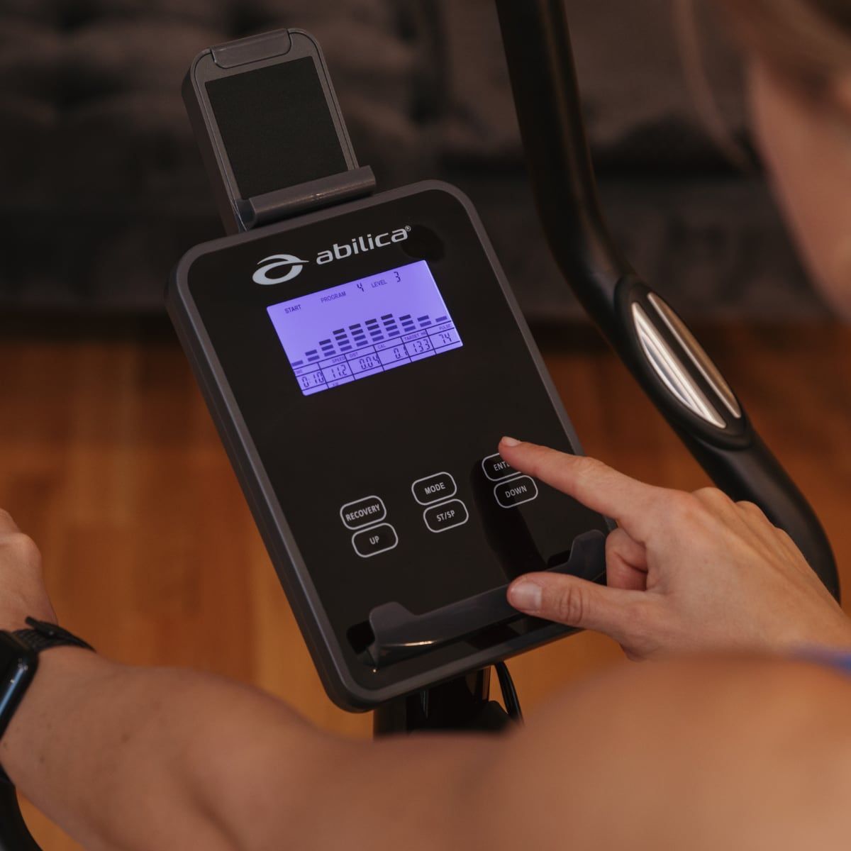 Den har en modern design och ett lågt steg som gör det enkelt att hoppa av och på cykeln. Abilica Bike 20 har motoriserat motstånd med 16 olika nivåer och en dator med 18 program som ger dig motiverande och varierad träning. Cykeln är försedd med en handpuls som kan läsas av i displayen. Ergometercykeln har även en hållare för din surfplatta/telefon, så att du kan se ditt favoritprogram medan du tränar. Den har massor av anpassningsmöjligheter då både styret och sätet kan justeras.