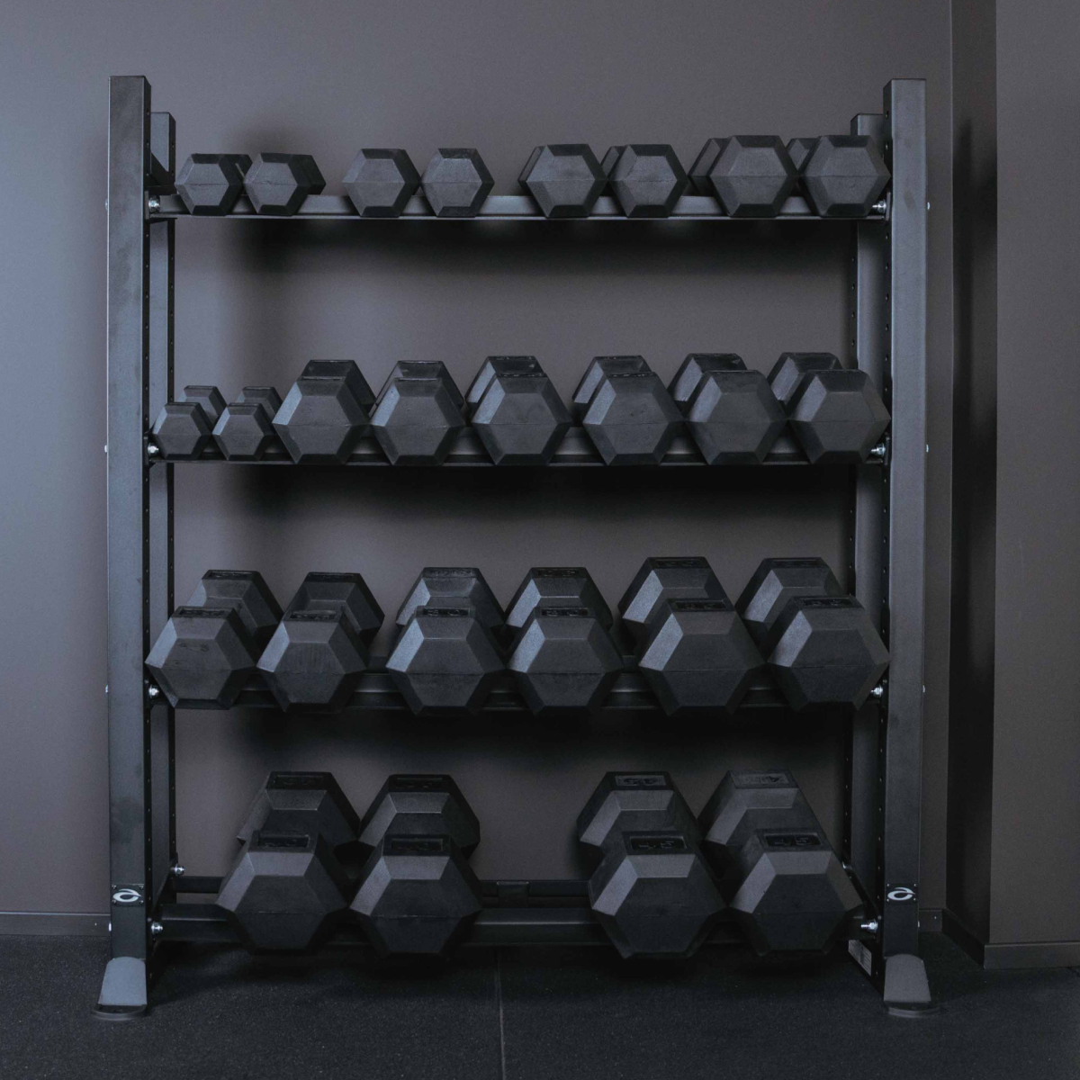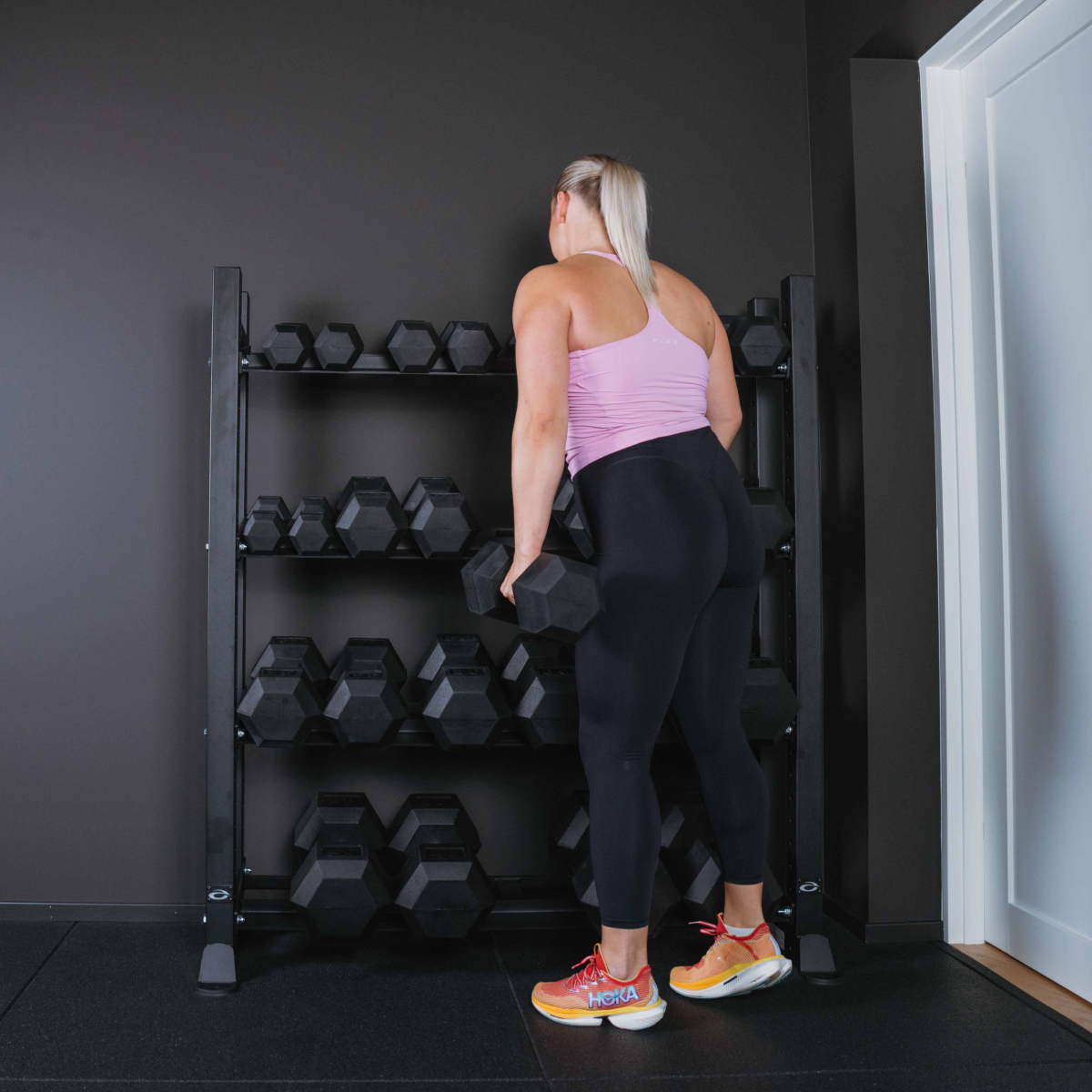 Abilica DumbbellRack Tier-3 är ett rejält hantelställ med 3 hyllor på 121 cm längd vardera med en total förvaringsyta på 363 cm.
