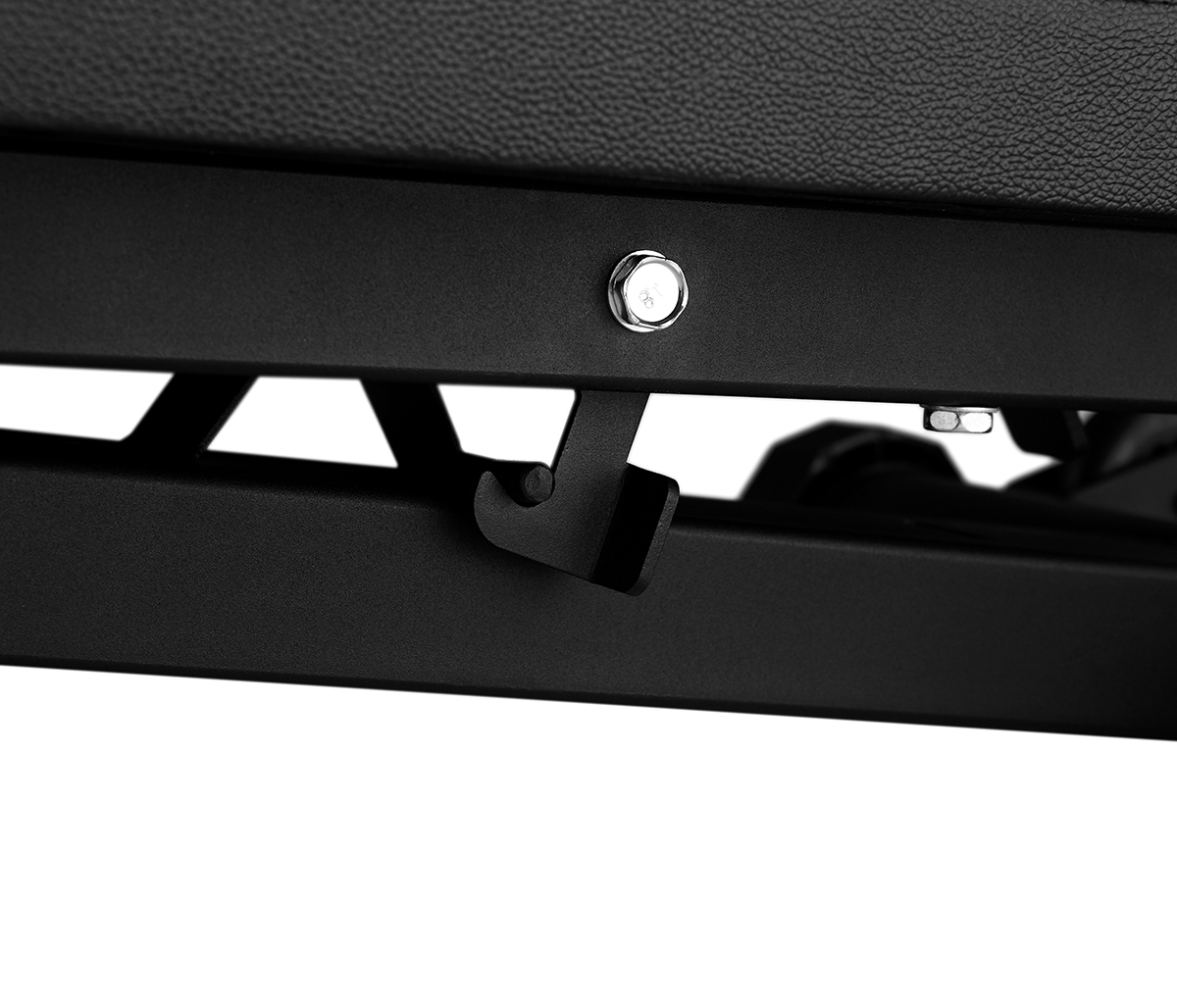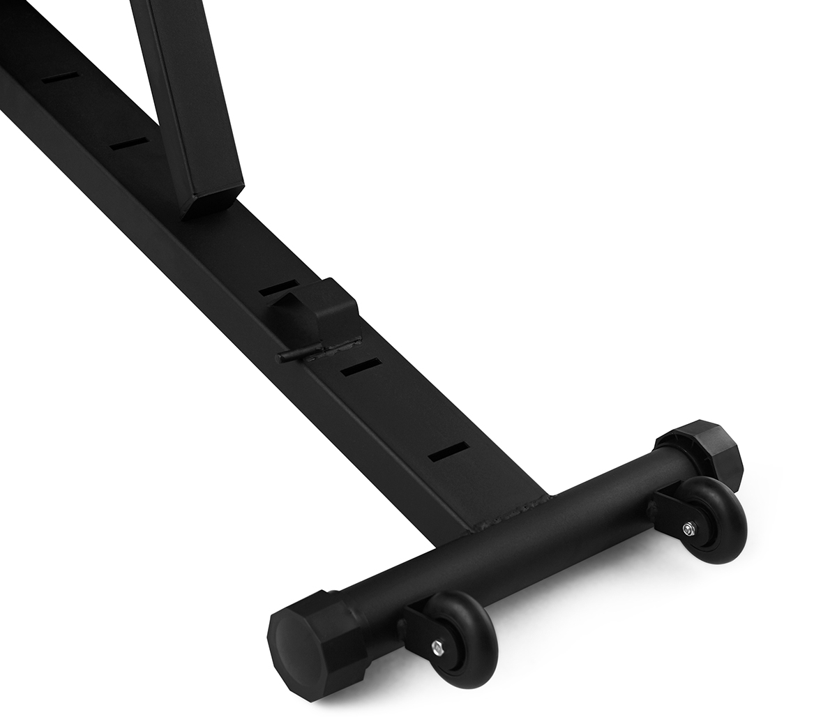 Den smarta och hopfällbara konstruktionen gör bänken enkel att förvara, även i små utrymmen. Med praktiska transporthjul och handtag kan du enkelt flytta bänken vid behov. Gummiskydd under fötterna säkerställer god stabilitet och skyddar golvet mot repor och slitage.