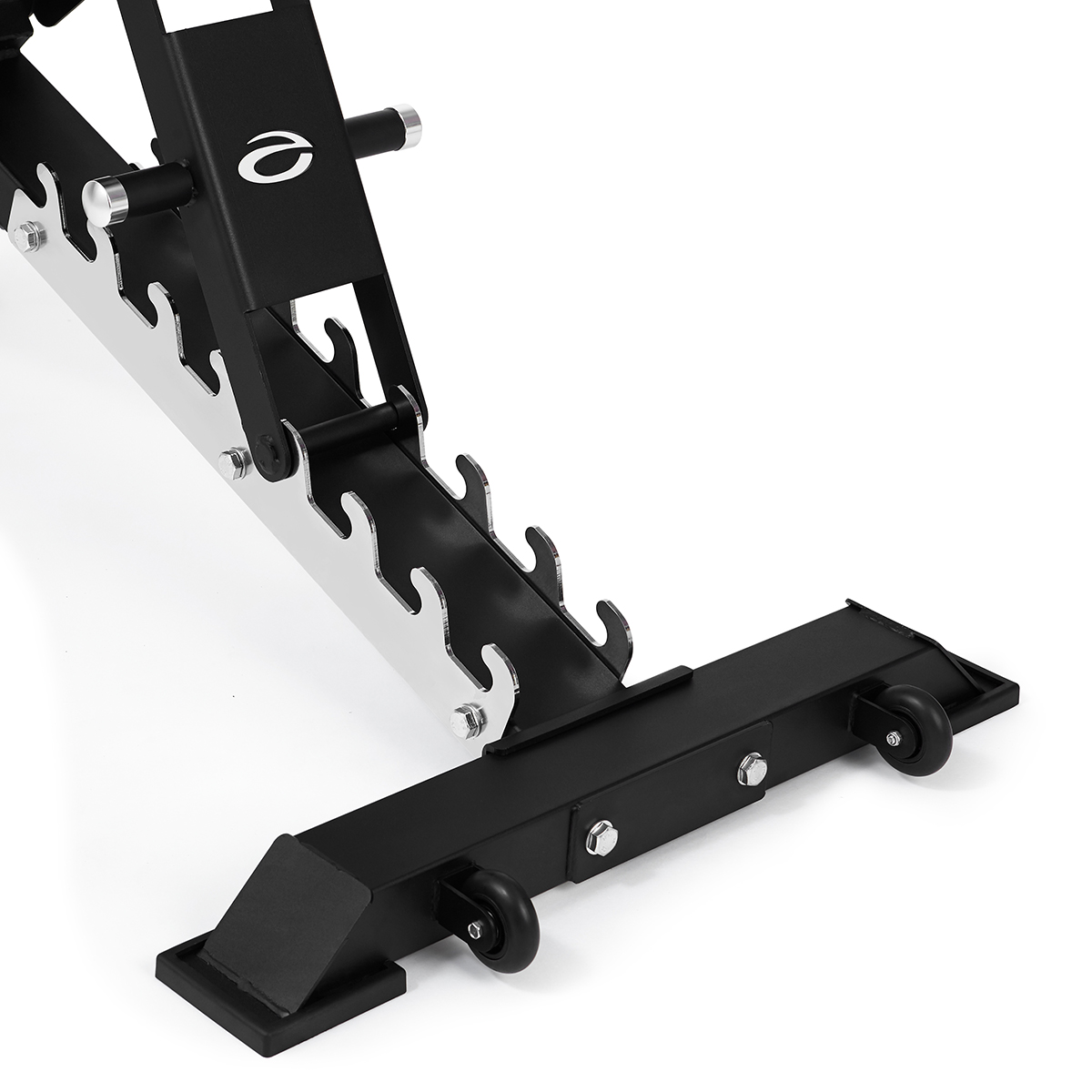 Träningsbänken är utrustad med praktiska transporthjul och ett stabilt handtag som gör den enkel att flytta efter behov. För att skona golvet är bänken också utrustad med gummiskydd under fötterna.