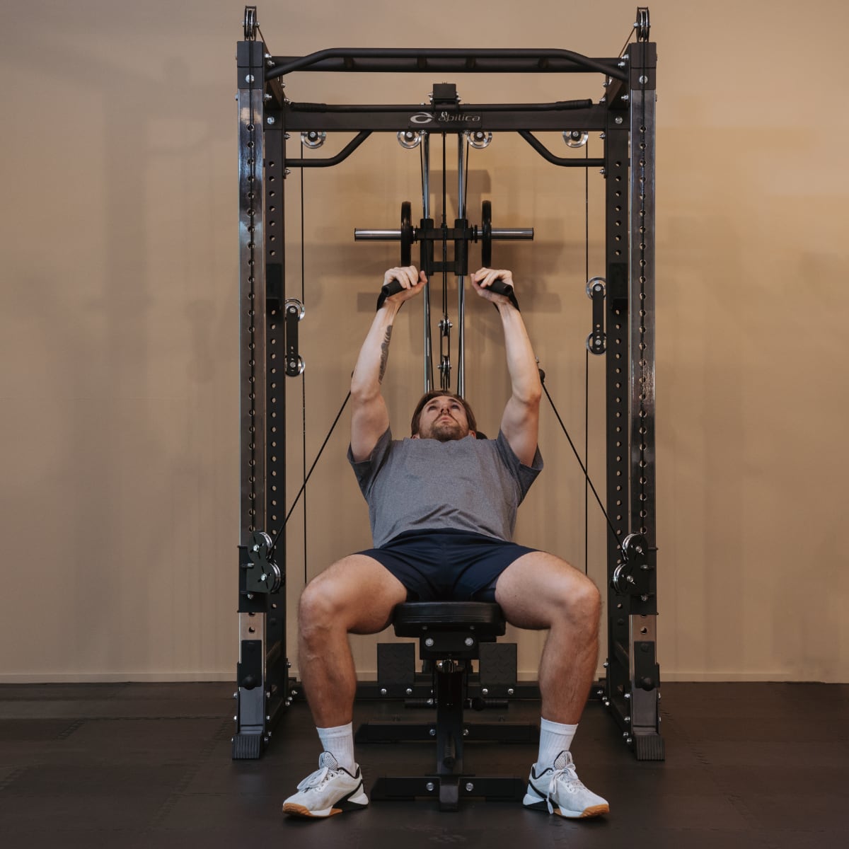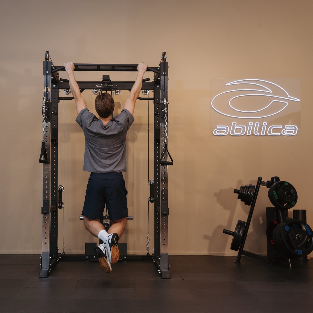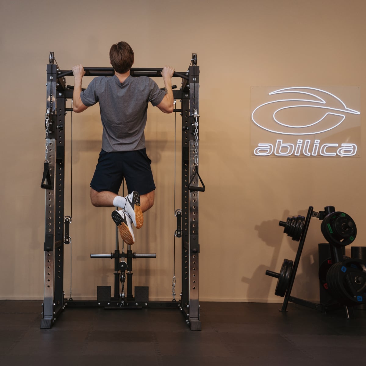 Abilica PR 550 är utrustad med pullups handtag med 29 mm diameter grepp med ett antal olika grepp positioner. Med ett fotavtryck på 168 x 124 cm har du gott om plats inne i racken för att göra alla övningar som antingen görs stående eller som kräver bänk