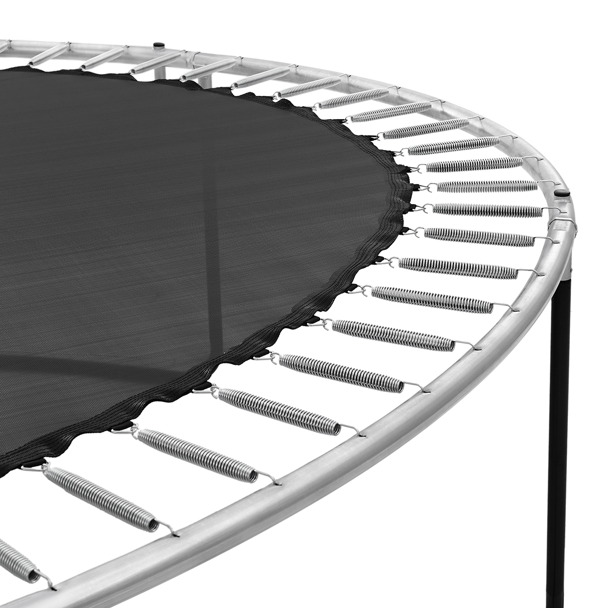Det patenterade fästsystemet mellan nät och ram ger extra stöd och stabilitet vid hoppning. Belastningen fördelas jämnt, vilket bidrar till ökad hållbarhet över tid. En integrerad glasfiberring i toppen av nätet håller nätet sträckt och stabilt, även efter lång tids användning.