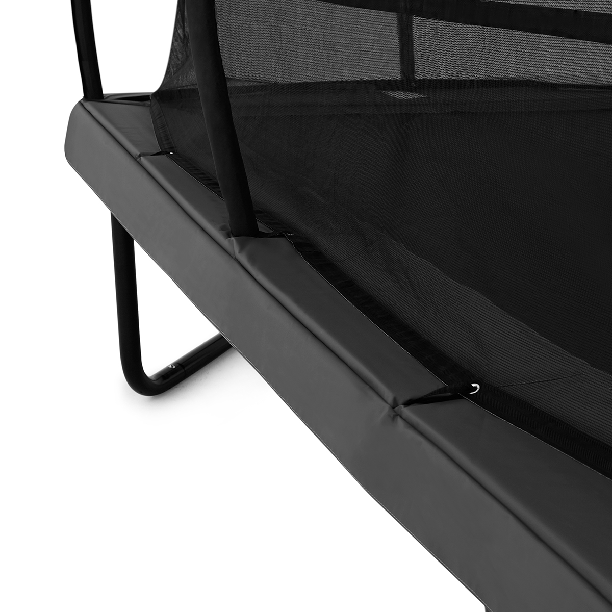 Det patenterade fästsystemet mellan nät och ram ger extra stöd och stabilitet vid hoppning. Belastningen fördelas jämnt, vilket bidrar till ökad hållbarhet över tid. En integrerad glasfiberring i toppen av nätet håller nätet sträckt och stabilt – även efter lång tids användning.