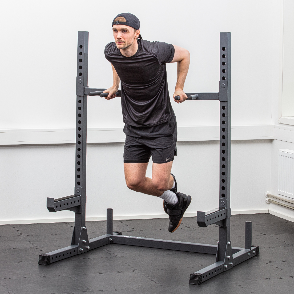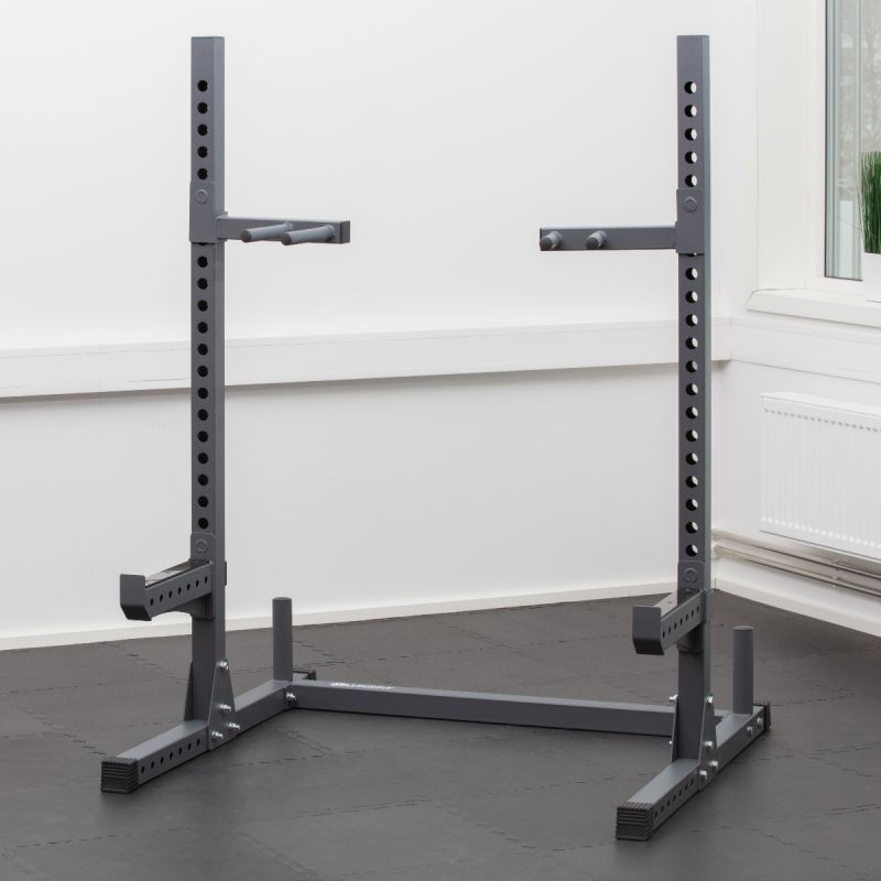 Detta knäböjsställ passar dig som vill ha en stabil och funktionell lösning för styrketräning hemma. Den kompakta konstruktionen ger gott om utrymme för övningar inne i racket samtidigt som det tar begränsat med plats i träningsrummet.