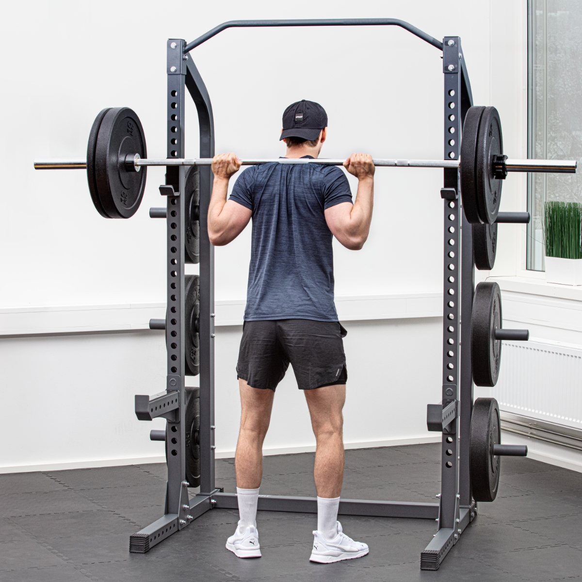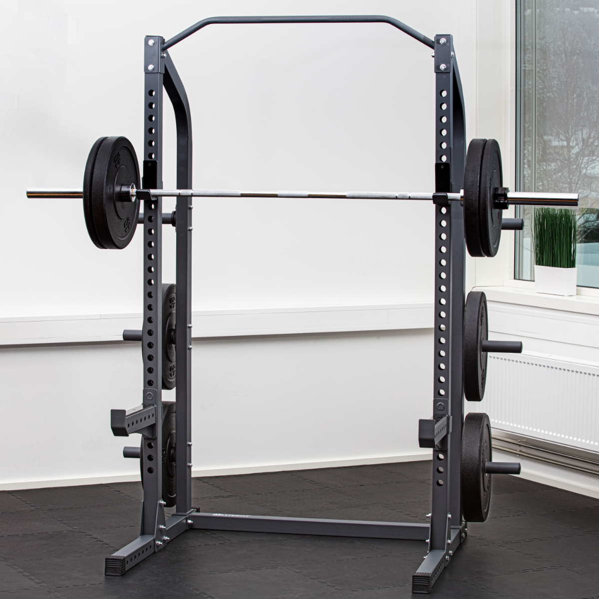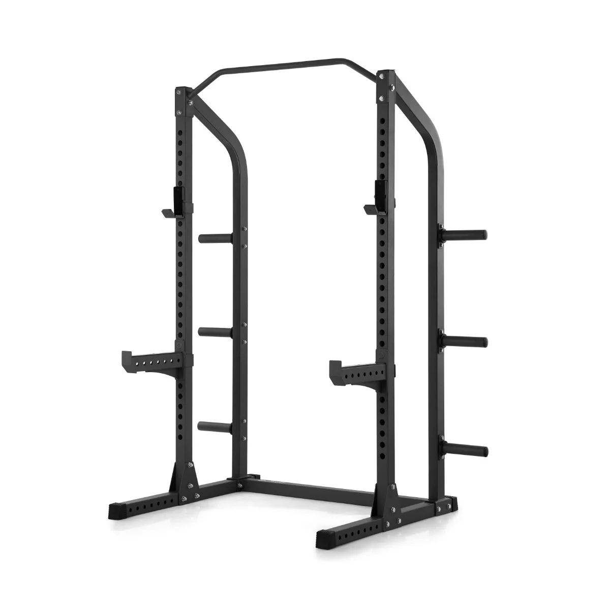 Max viktkapacitet är 250 kg på jhookarna, 250 kg på säkerhetsarmarna och 150 kg på pullupstången. Max viktbelastning per förvaringspinne är 75 kg. Masterfit Dip Attachment, våra bänkar och Landmine Attachment, som köps separat, utökar övningsbiblioteket och gör detta till det perfekta halvstället för ditt gym.