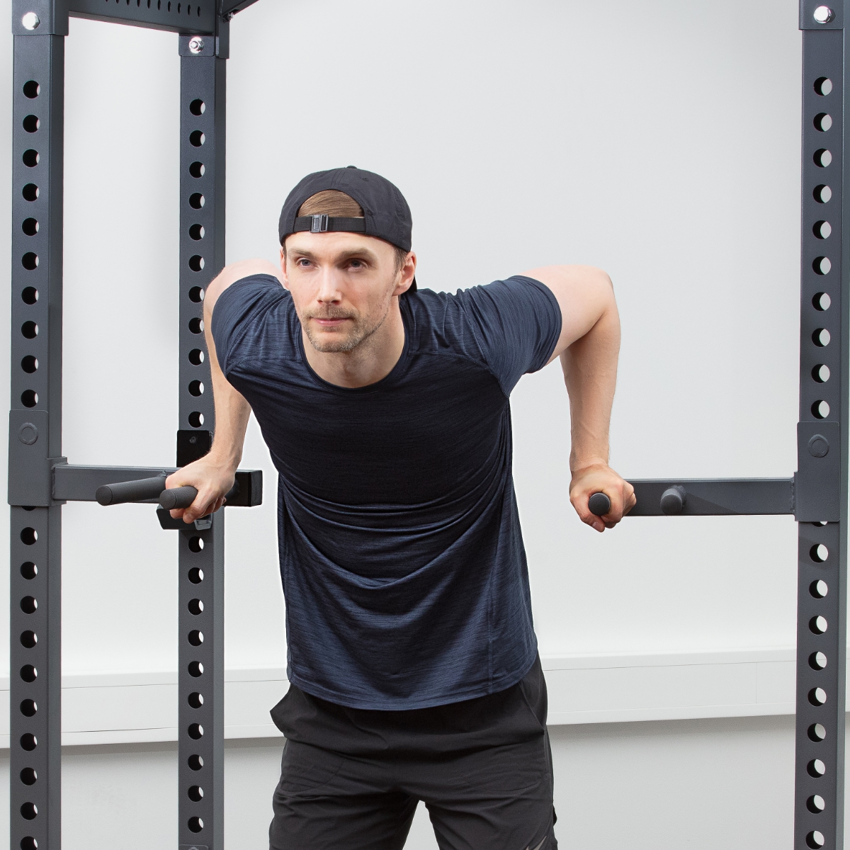 Dip-tillbehöret har två olika vinklade handtag som ger en bredd på 55-60 cm och 75-80 cm. Den goda bredden du får med dessa handtag gör det mycket anpassningsbart både när det gäller greppbredd för dips, men också som en hållare för t.ex. resår för assisterade dips. Masterfit Dip Attachment passar alla ställ med en ramstorlek på 60 x 60 mm med 26 mm diameter hål. Säljs i par.