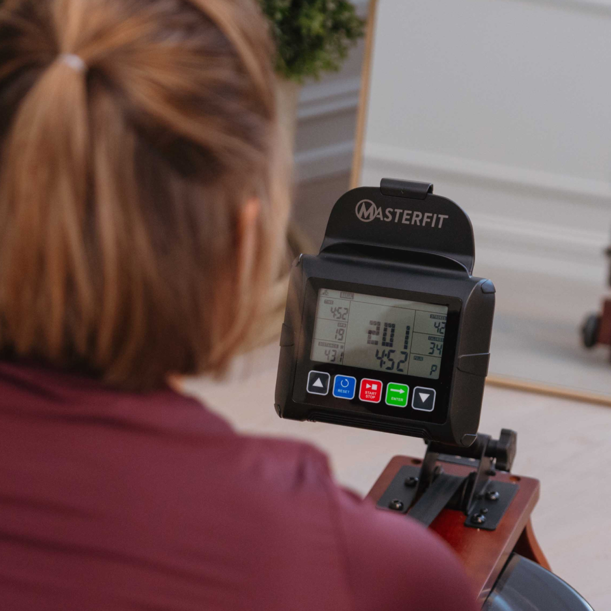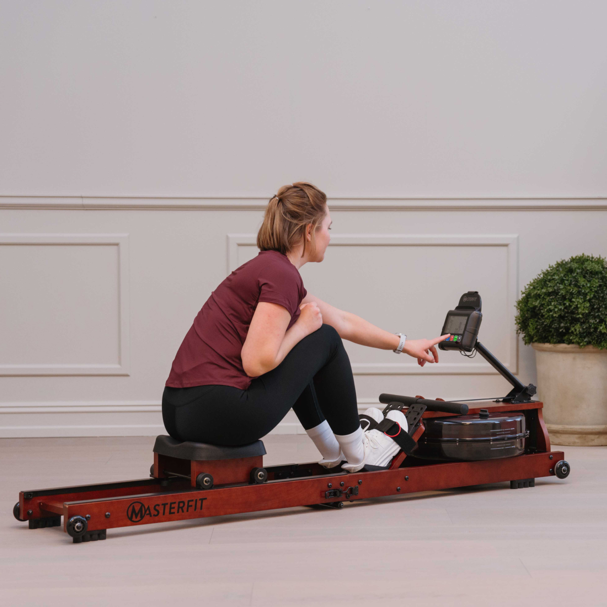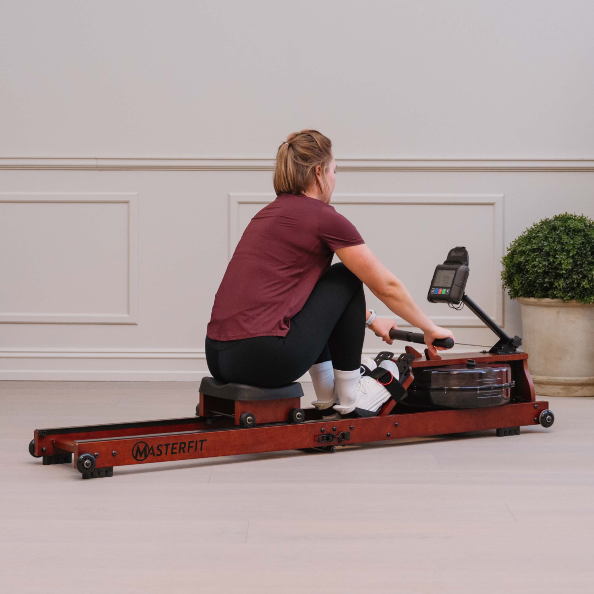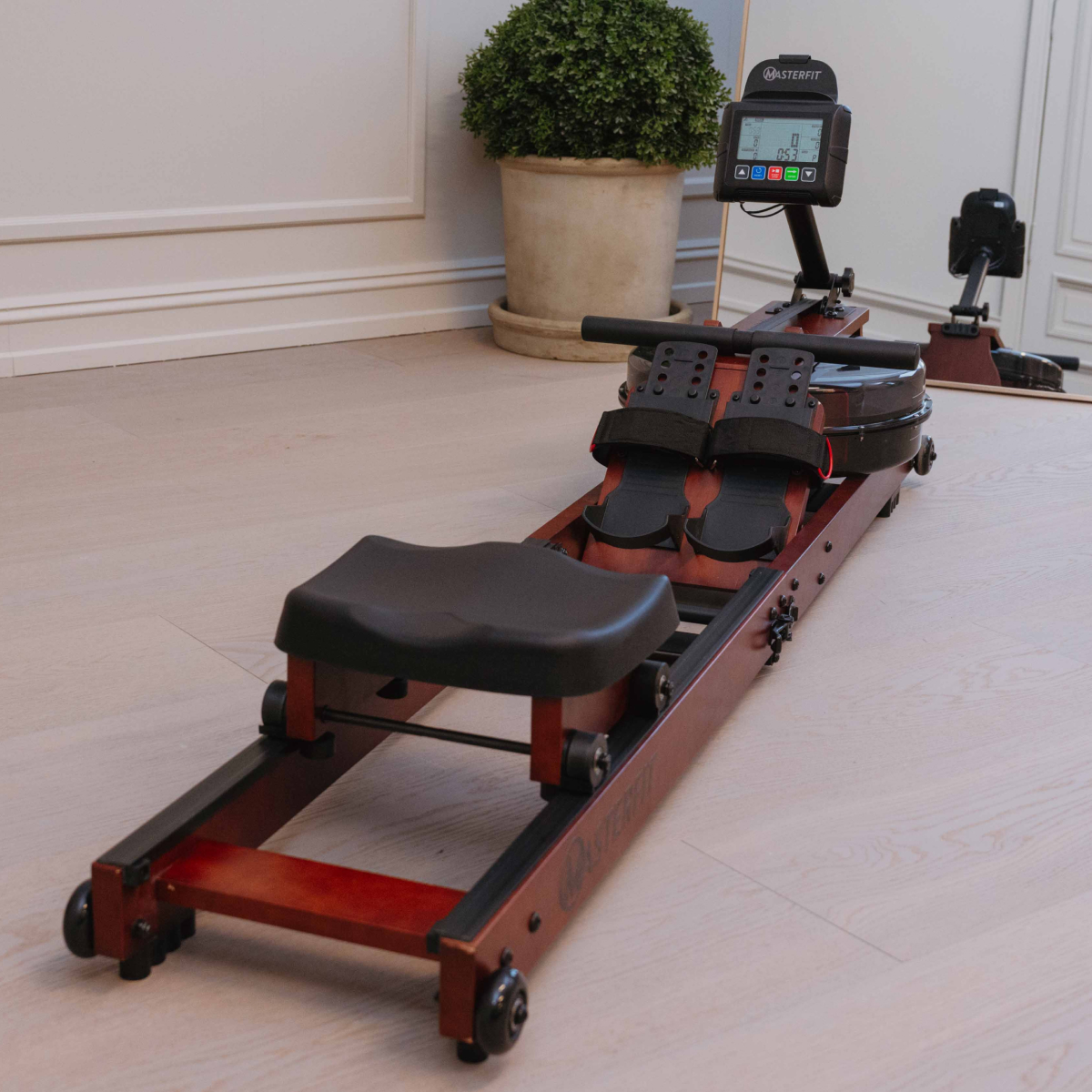 Masterfit W Rower 500 ger dig en realistisk roupplevelse – där vattnet står för motståndet. Varje rotag ger ett naturligt ljud och känsla av riktiga åror i vattnet, samtidigt som du helt själv styr intensiteten. Ju hårdare du ror, desto högre blir motståndet – precis som på vattnet. Det finns inga manuella inställningar – här är det din egen insats som avgör passet.