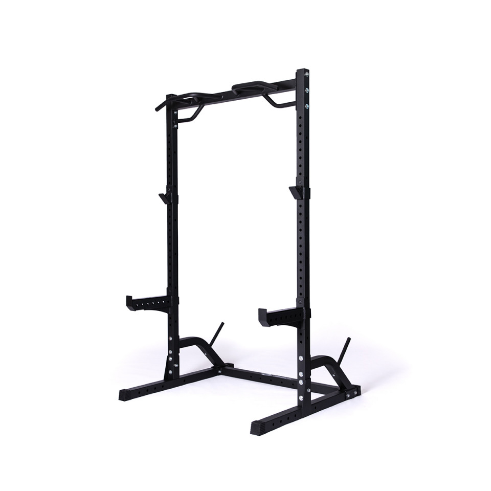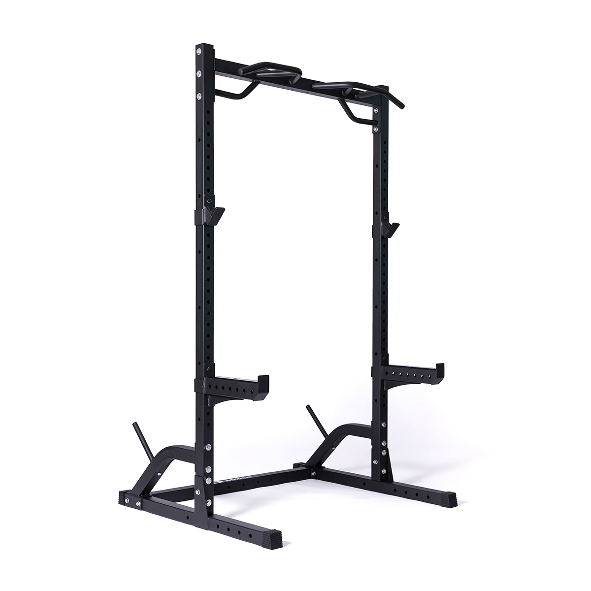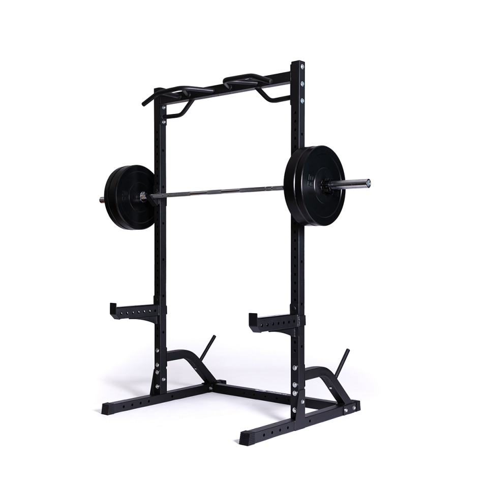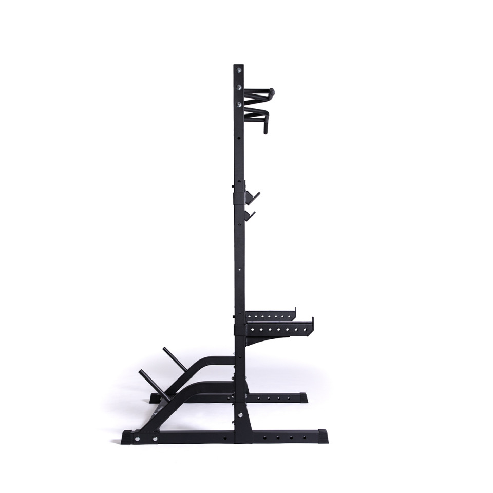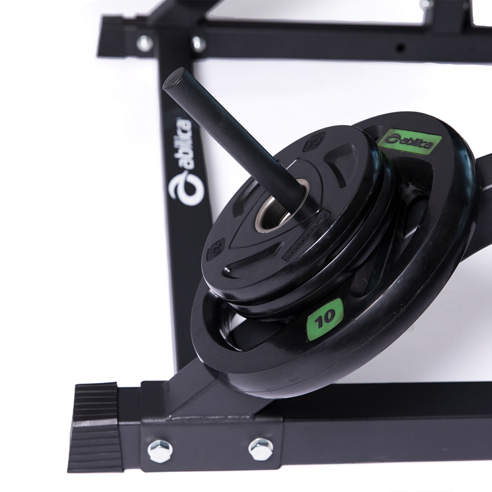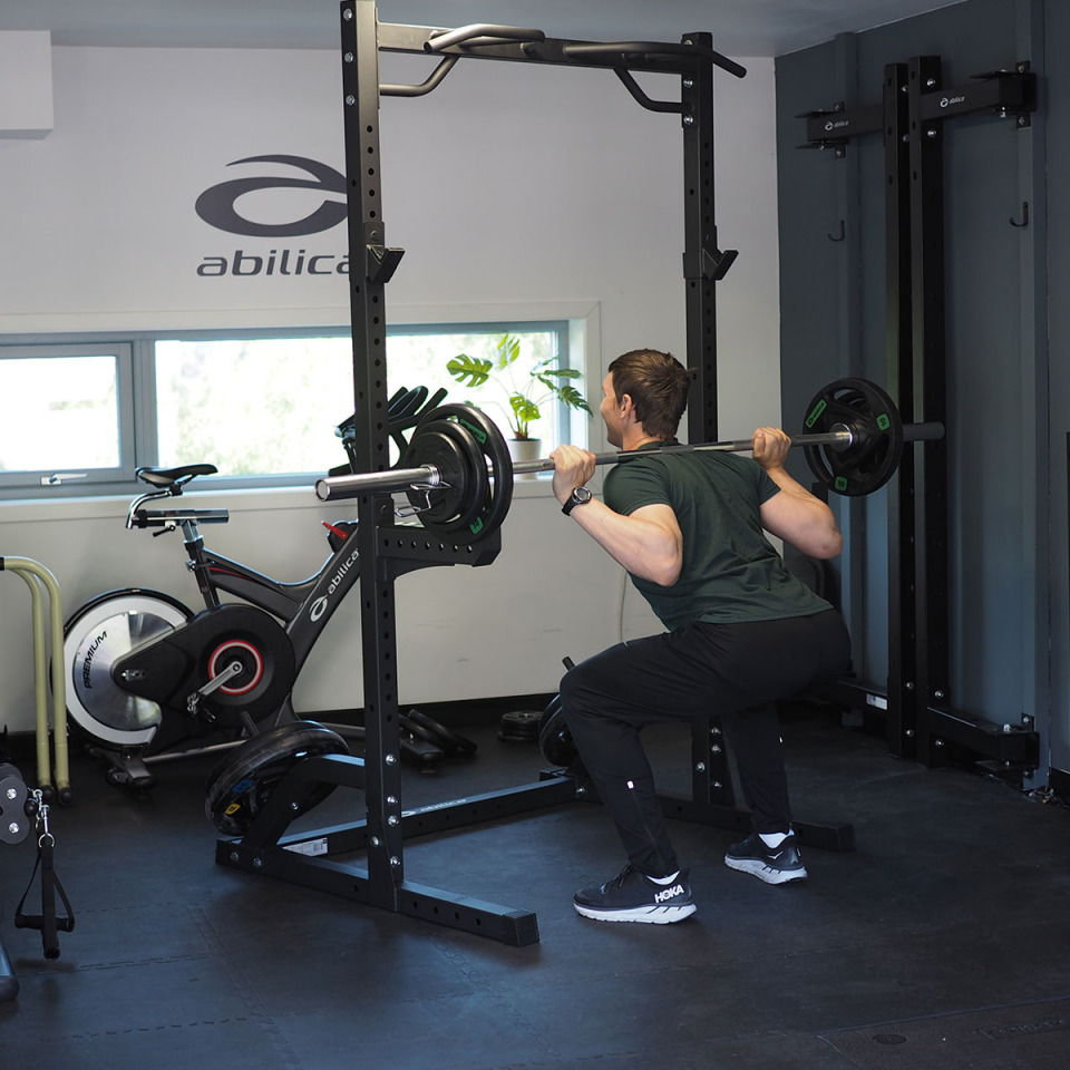 Abilica HalfRack 40 är ett rejält halfrack för styrketräning med fria vikter som är perfekt för både hemmaträning och företagsmarknaden. Med “slide-and-twist”-fästen kan höjden på både skivstångshållare och säkerhetsarmar ändras snabbt och enkelt. Skivstångshållarna tål en belastning på 300 kg, säkerhetsarmarna 300 kg och pullupshandtagen 200 kg. Allt detta gör att Abilica HalfRack 40 tål den belastning som krävs för ett bra träningspass. Med gott om plats inne i ställningen finns plats för en bänk vilket gör den utmärkt för att träna alla basövningar och stödövningar. Vill du ha ett enklare alternativ kan du även köpa ytterligare JHooks, så att du har förinställt hållarna för olika övningar. Abilica HalfRack 40 är utrustad med ett pullup-handtag med 5 olika grepp och 2 handtag för att fästa elastiska band. Den har även två praktiska förvaringspinnar för 25 och 50 mm viktskivor på baksidan för enkel åtkomst när du snabbt behöver byta viktskivor under ditt träningspass. Vid köp av Abilica Lat-Attachment 40 och Abilica Dip-Attachment 40 utökas träningsmöjligheter ytterligare med övningar som sittande kabelrodd, kabeldragningar och dips för att nämna några. Denna produkt är inte lämplig för utomhusförvaring och bör inte placeras på fuktiga/våta ytor.