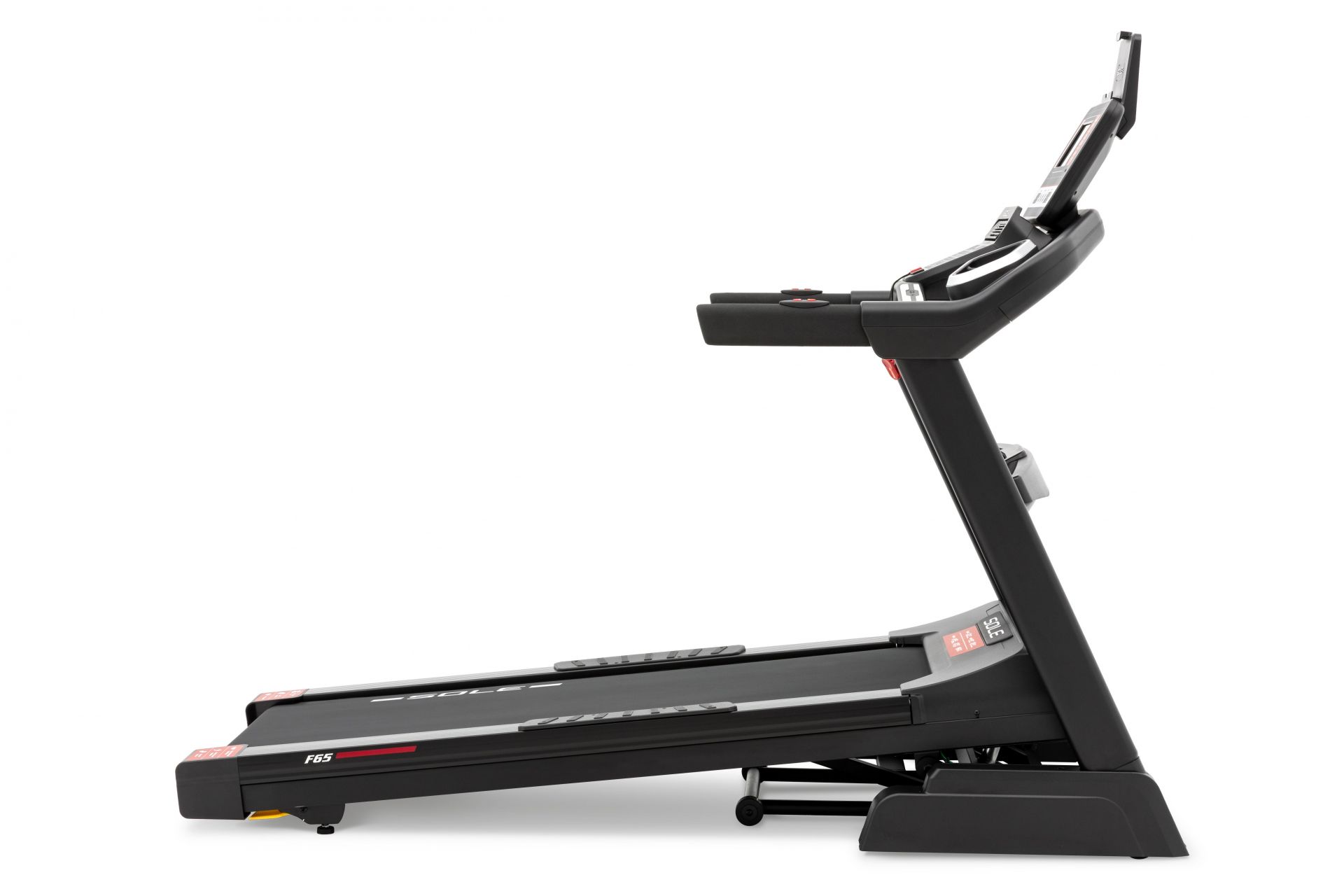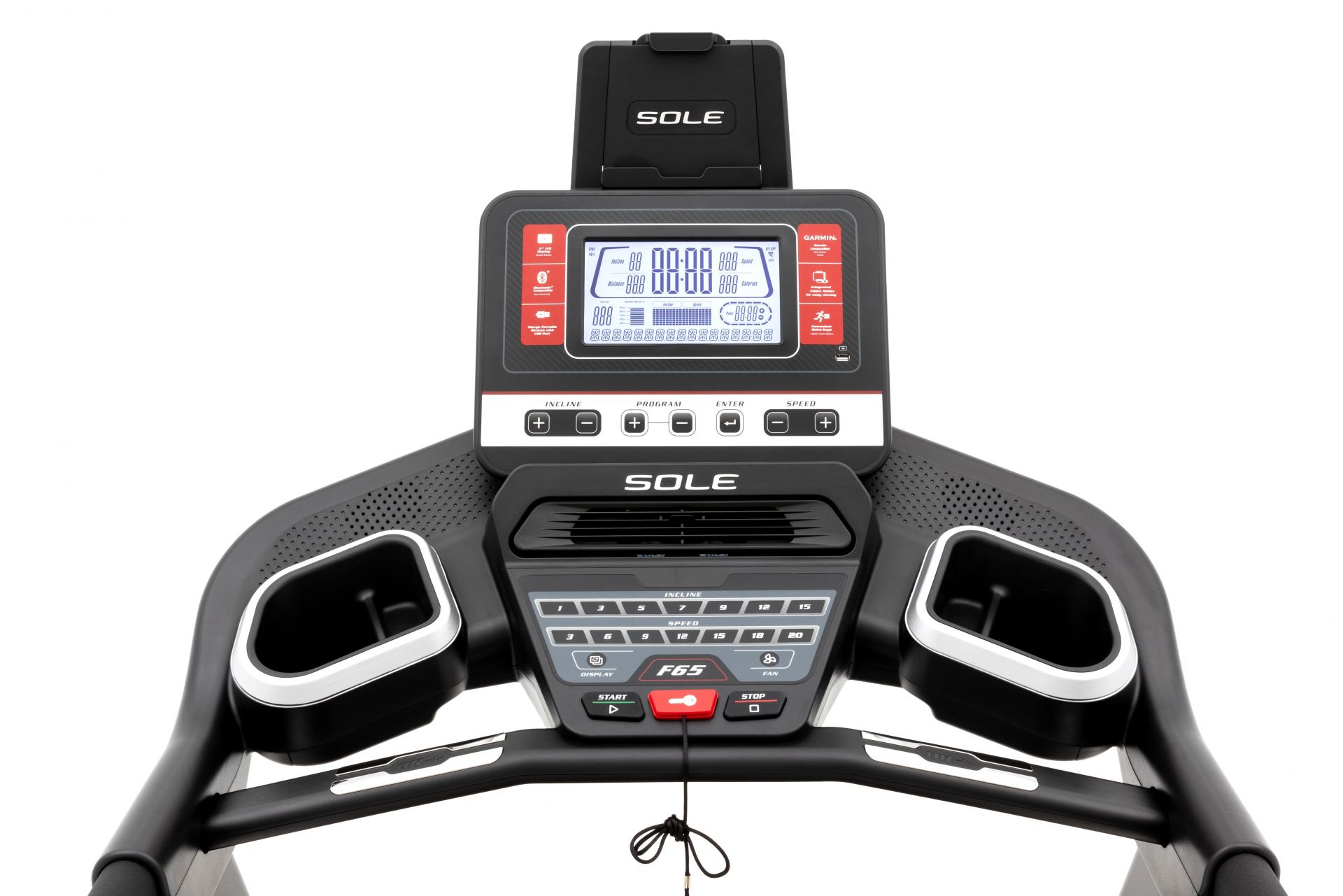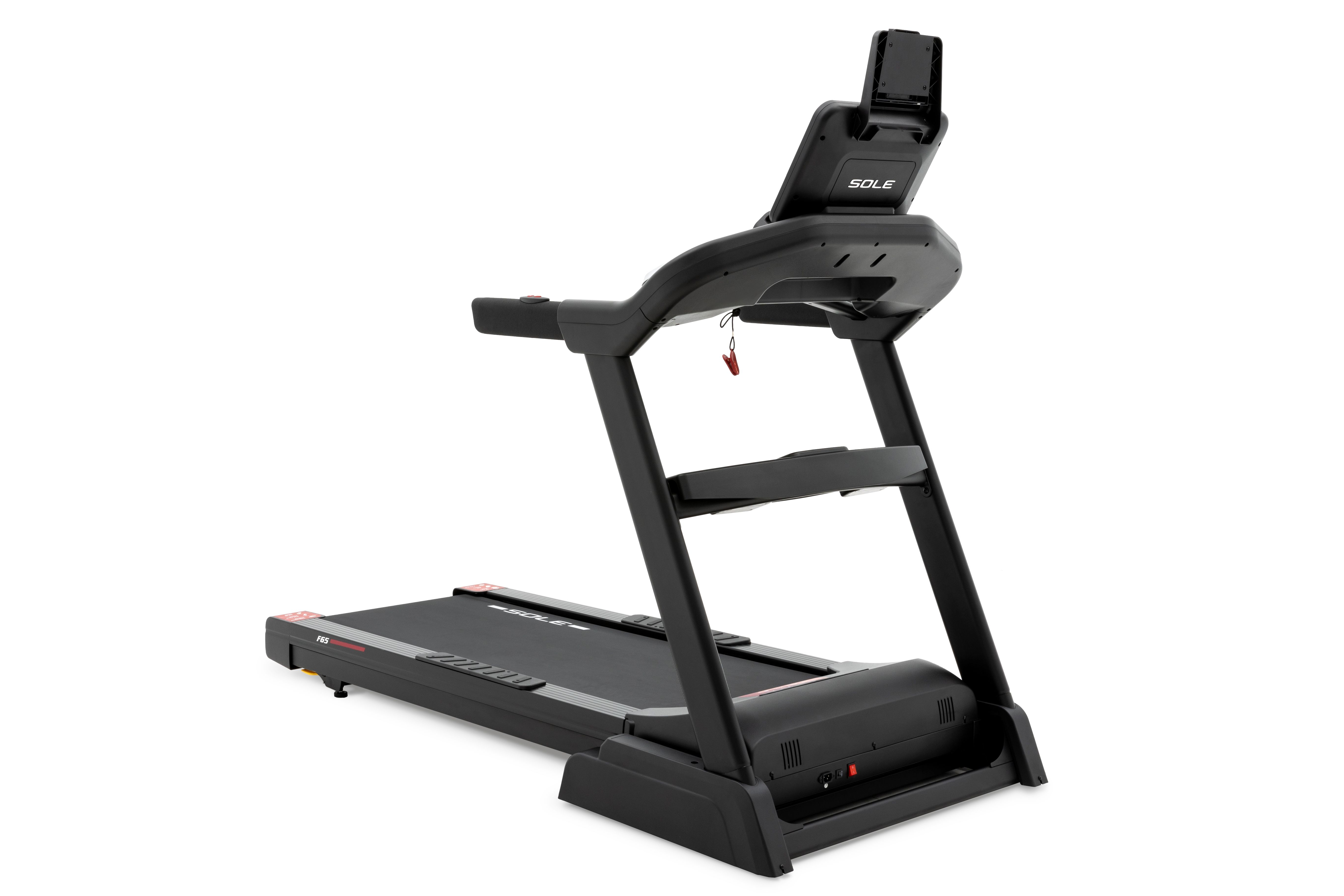 F65 löpband har kylfläktar och hastighets- och lutningskontroller på armstöden för att göra löpningen extra smidig. Den användarvänliga konsolen visar hastighet, lutning, tid, avstånd, kalorier, puls och tempo, tillsammans med en 1/4-mils spårningsfunktion och en topp- och dalgraf för olika program. Integrerade högtalare låter dig ansluta till medieenheten och spela musik under träningen.