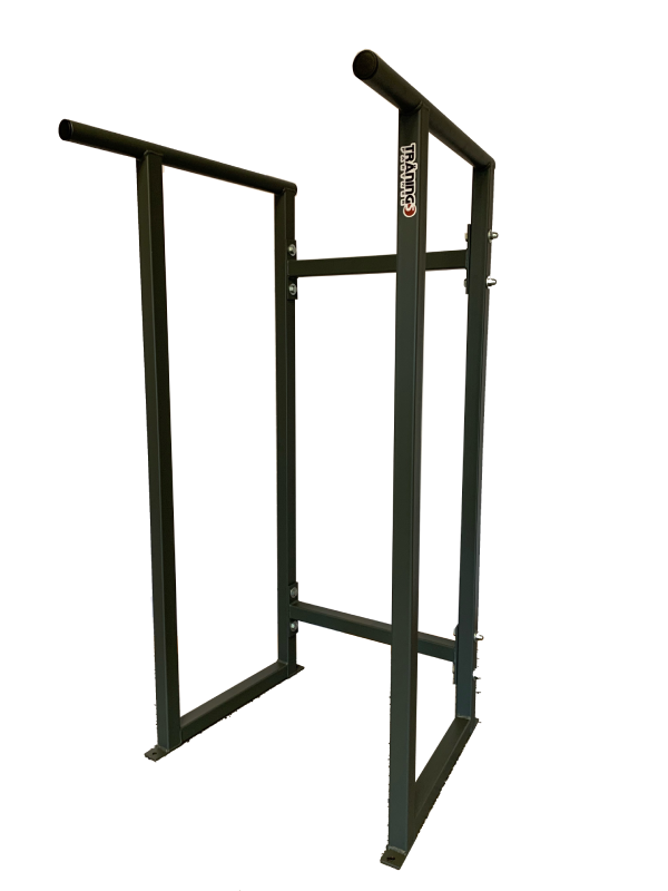 Free Standing Dip Rack är en fristående träningsstation för kroppsviktsträning. Racket har en solid stålkonstruktion med ett bekvämt grepp på 38 mm i diameter. Stationen innehåller bulthål på ramen för inskruvning i golvet, som vi rekommenderar att använda för ökad stabilitet och användarsäkerhet.